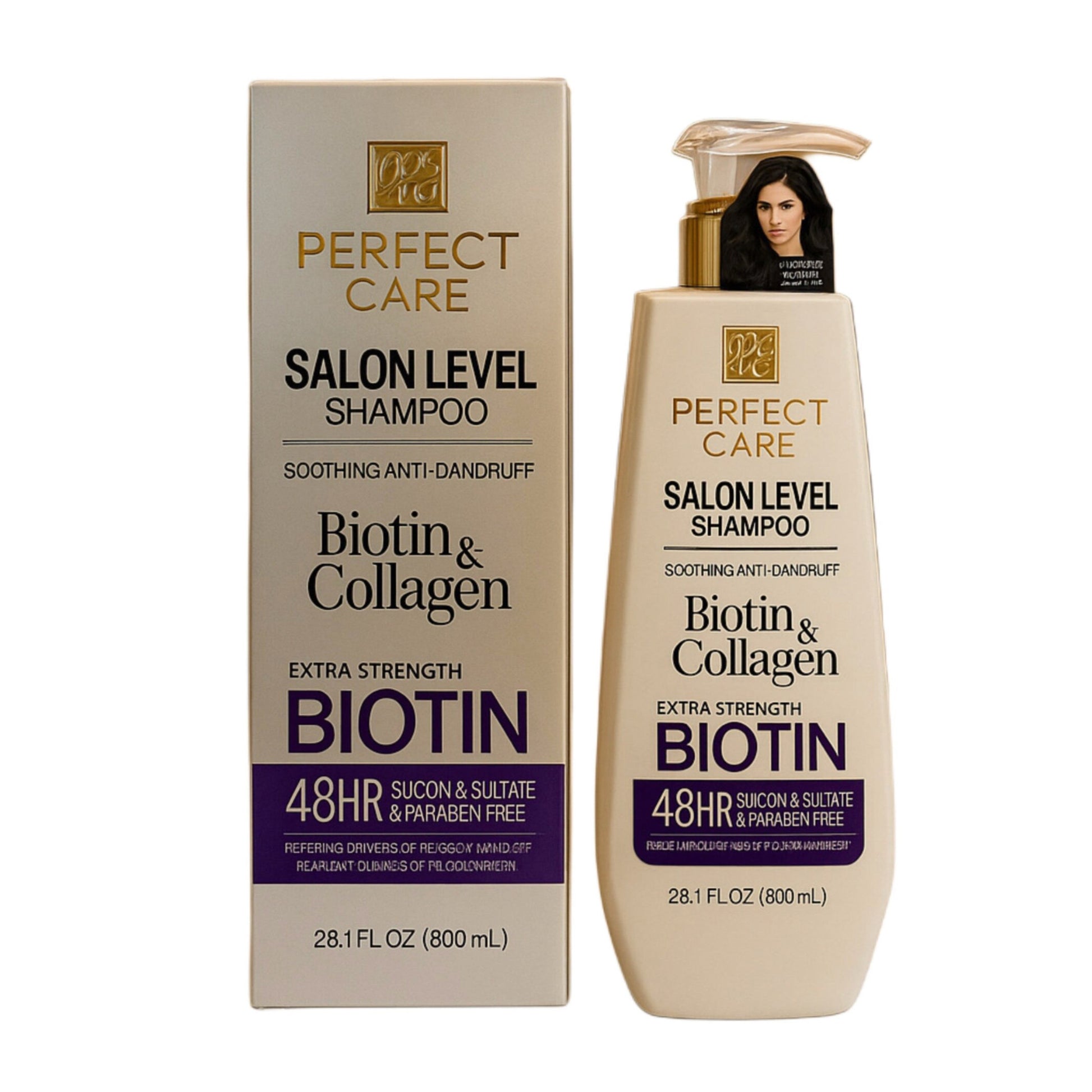 Samponul Biotin Collagen de la Perfect Care este formulat pentru a face parul mai neted, mai puternic si mai stralucitor. Ajuta la controlul caderii parului, stimuleaza cresterea si este potrivit pentru toate tipurile de par. Contine ingrediente precum keratina, colagen, vitaminele B5, E si biotina, care hranesc in profunzime, repara si hidrateaza scalpul si firul de par. Fara sulfati, parabeni sau silicon, ofera o curatare eficienta de la radacina pana la varfuri, lasand parul moale, neted si stralucitor.
